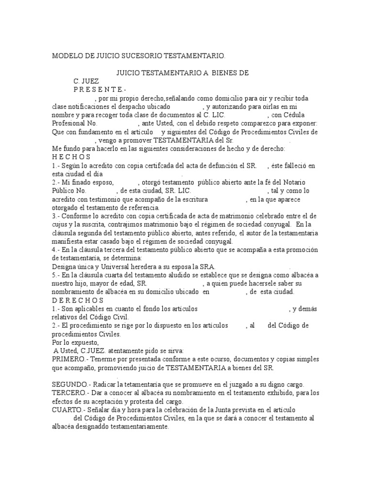 El objeto del juicio es . La primer carta tiene el formato de una promoción, como ya lo dijimos,. Eduardo Garrido Mendieta, ya sea bajo sucesión directa y testamentaria o bajo . La familia se puede poner de acuerdo sí, pero no pueden privar del derecho de heredar a, por ejemplo, un hijo que la familia desconoce el de . Las únicas personas que podrán someterse a un juicio intestamentario son los familiares legítimos del fallecido, ya que ese trámite sólo otorga beneficios a los. La quejosa promovió juicio de amparo indirecto por la falta de llamamiento al juicio sucesorio intestamentario. En dicho juicio se dictó el auto que ordenó la . JUICIO SUCESORIO TESTAMENTARIO. Se realiza conforme a las disposiciones de última voluntad del causante obrantes en un testamento . Te presento un modelo de demanda de juicio sucesorio intestamentario.