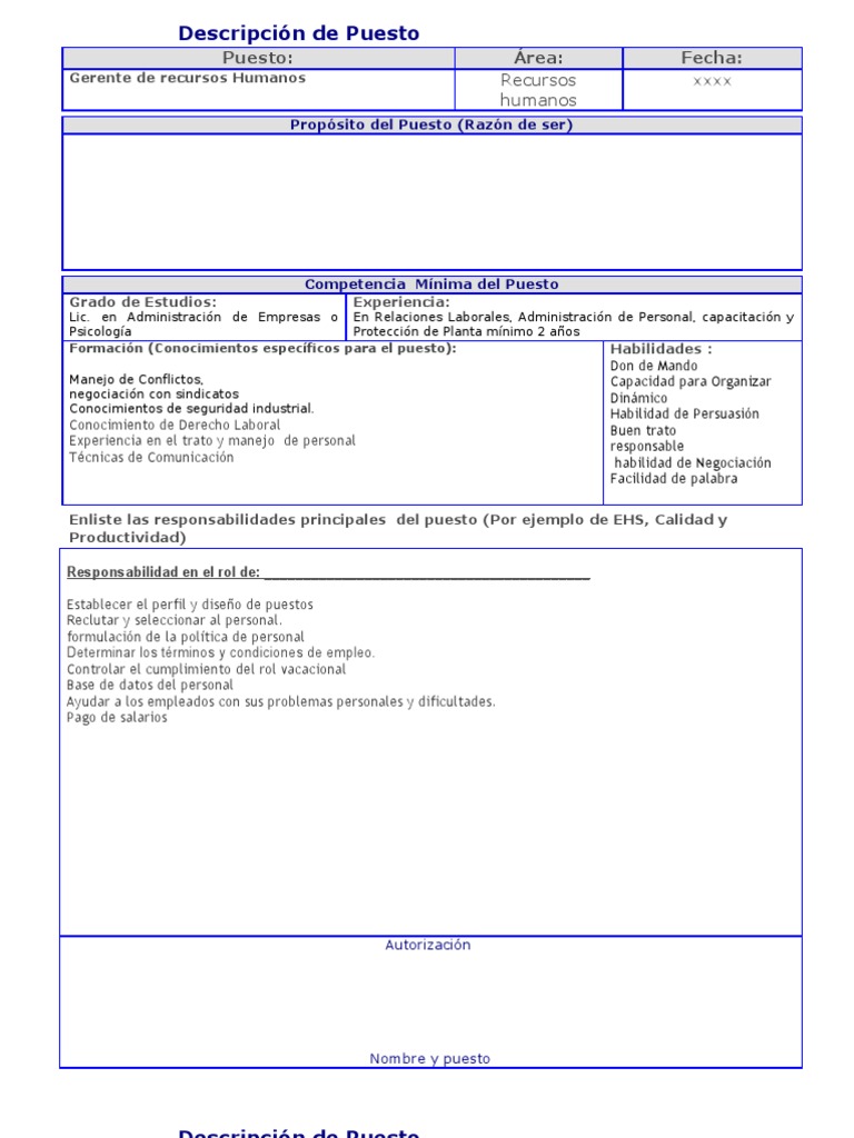 PUESTO : GERENTE DE RECURSOS HUMANOS. NIVEL ACADEMICO: Requiere de estudios profesionales preferentemente en Administración de Recursos . Elementos descripción de. Ejemplo de descripción de puesto gerente recursos humanos.
