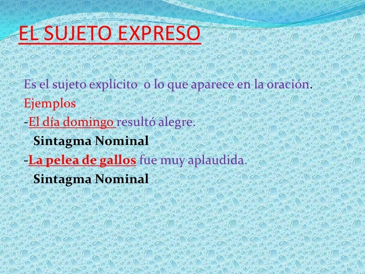 Es el que no está expreso , pero se puede reponer por. Un sujeto puede ser clasificado como expreso , desinencial (tácito), simple , compuesto ,. De esta forma, se diferencia del sujeto compuesto , que cuenta con más de un núcleo. Veamos las siguientes oraciones.